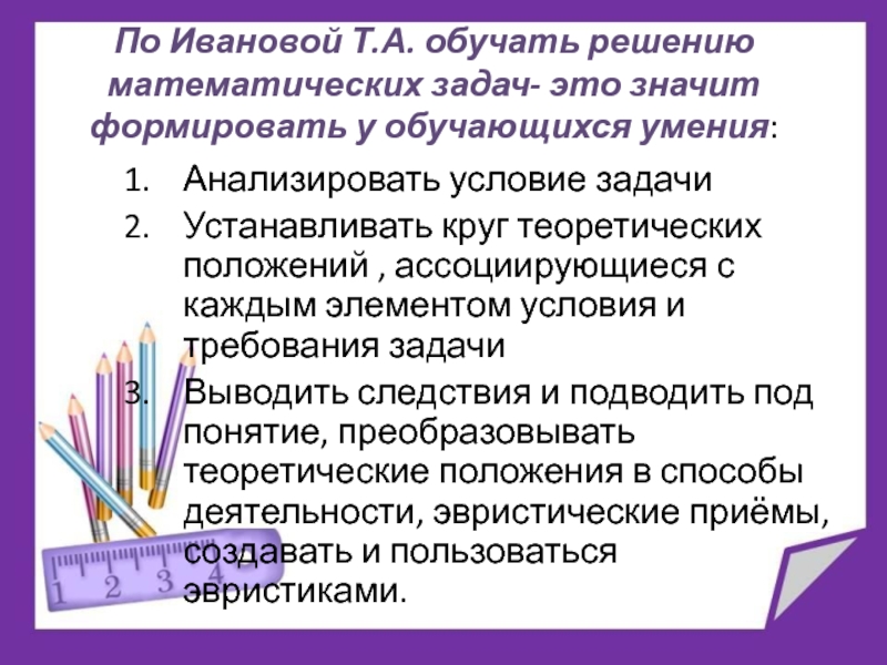 Слайд 17По Ивановой Т.А. обучать решению математических задач- это значит формировать у