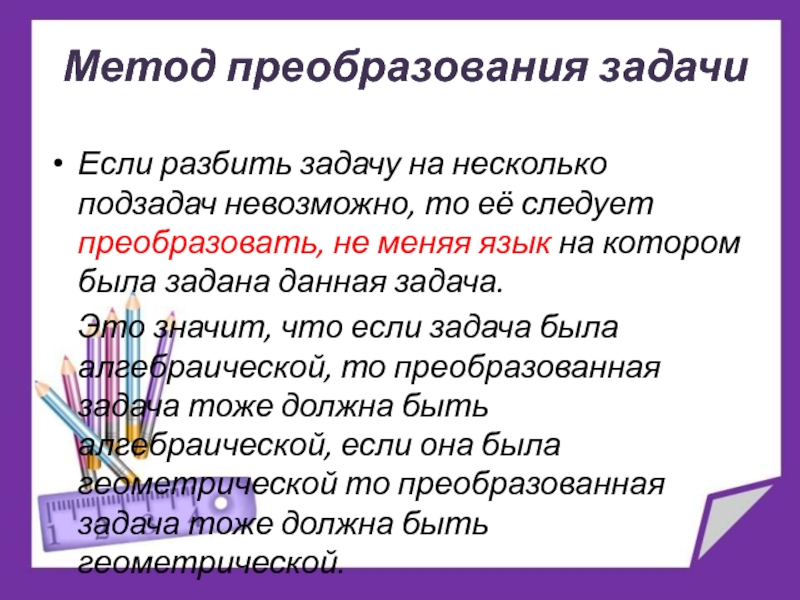 Это значит, что если задача была алгебраической, то преобразованная задача тоже должна быть алгебраической, если она была геометрической то преобразованная задача тоже должна быть геометрической.
