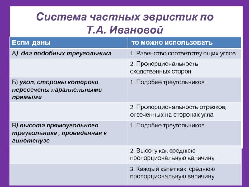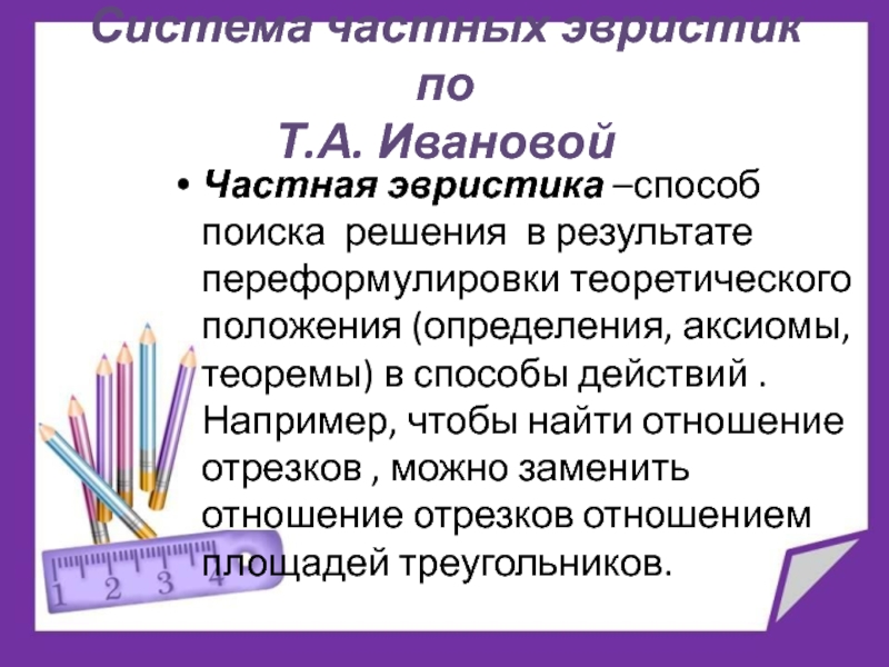 результате переформулировки теоретического положения (определения, аксиомы, теоремы) в способы действий . Например, чтобы найти отношение отрезков , можно заменить отношение отрезков отношением площадей треугольников.