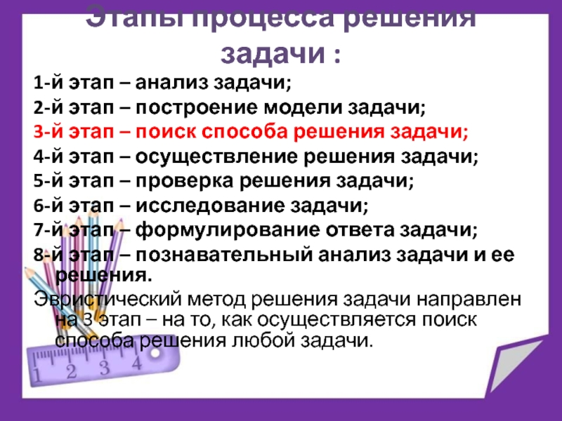 Эвристический метод решения задачи направлен на 3 этап – на то, как осуществляется поиск способа решения любой задачи.