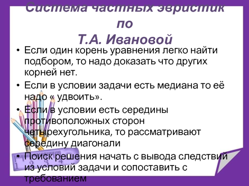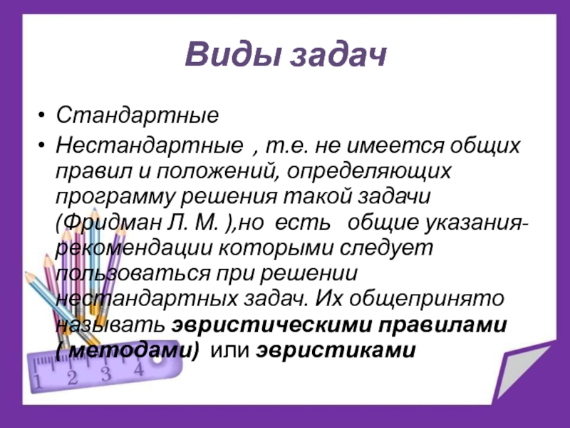 определяющих программу решения такой задачи (Фридман Л. М. ),но есть общие указания-рекомендации которыми следует пользоваться при решении нестандартных задач. Их общепринято называть эвристическими правилами ( методами) или эвристиками