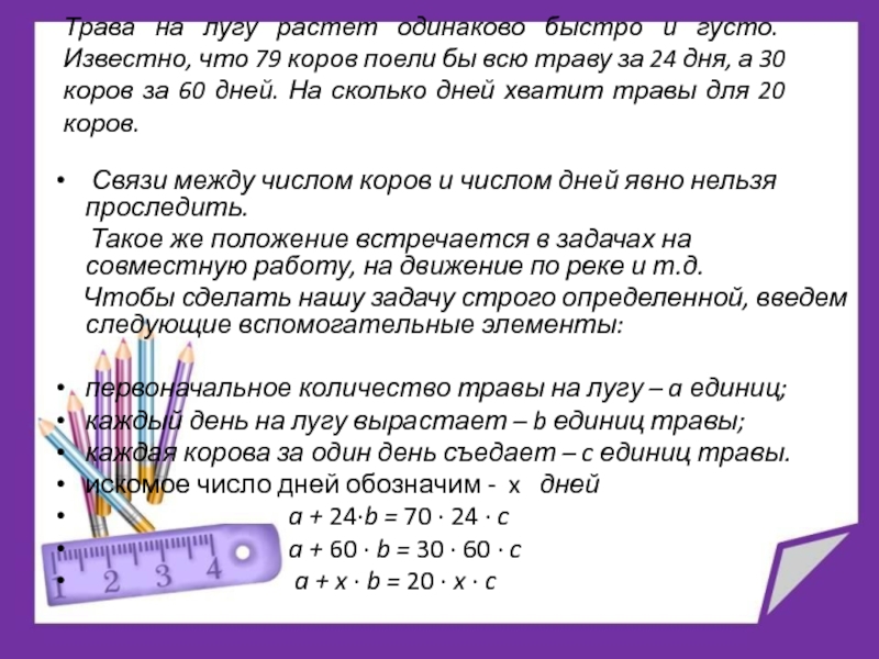 что 79 коров поели бы всю траву за 24 дня, а 30 коров за 60 дней. На сколько дней хватит травы для 20 коров.