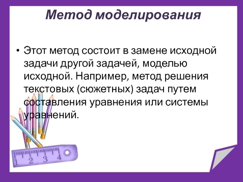 моделью исходной. Например, метод решения текстовых (сюжетных) задач путем составления уравнения или системы уравнений.