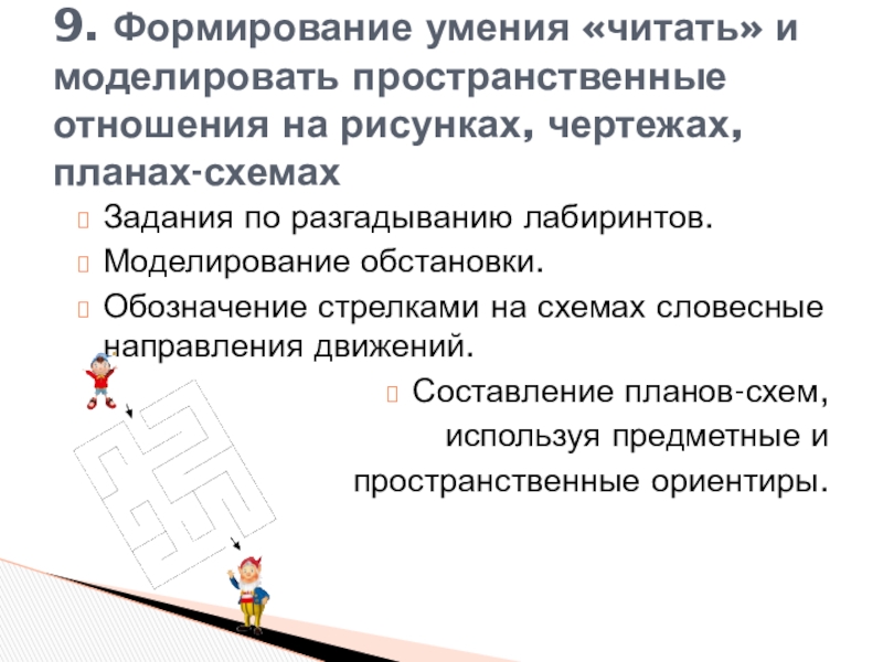9. Формирование умения «читать» и моделировать пространственные отношения на рисунках, чертежах, планах-схемах