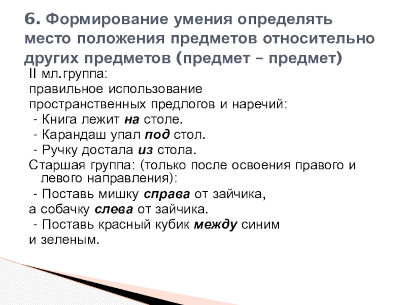 6. Формирование умения определять место положения предметов относительно других предметов (предмет – предмет)