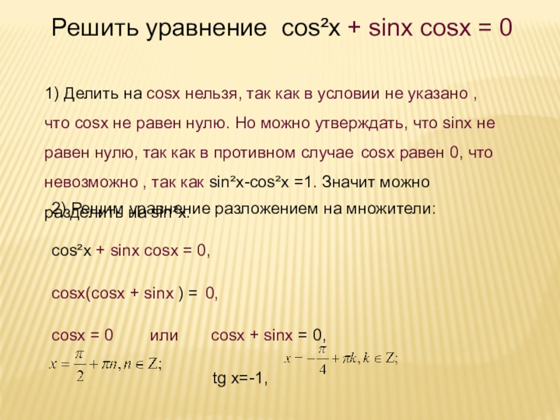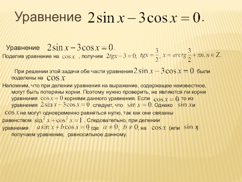 Напомним, что при делении уравнения на выражение, содержащее неизвестное, могут быть потеряны корни. Поэтому нужно проверить, не являются ли корни уравнения корнями данного уравнения. Если , то из уравнения следует, что . Однако и