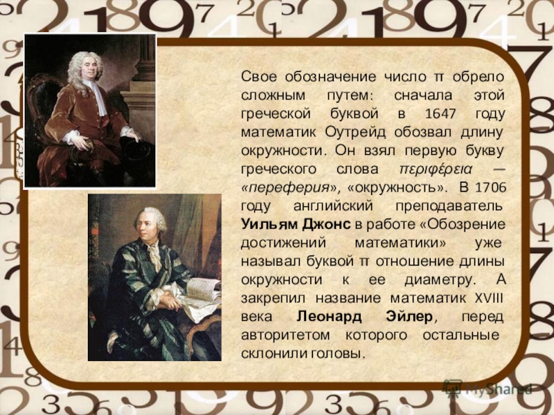 в 1647 году математик Оутрейд обозвал длину окружности. Он взял первую букву греческого слова περιφέρεια — «переферия», «окружность». В 1706 году английский преподаватель Уильям Джонс в работе «Обозрение достижений математики» уже называл буквой π отношение длины окружности к ее диаметру. А закрепил название математик XVIII века Леонард Эйлер, перед авторитетом которого остальные склонили головы.