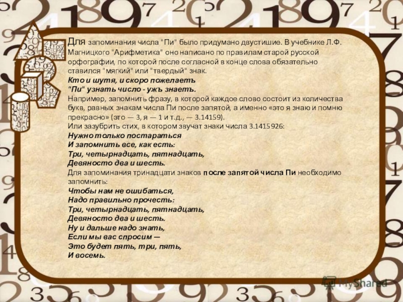 Слайд 12Для запоминания числа "Пи" было придумано двустишие. В учебнике Л.Ф.Магницкого "Арифметика"