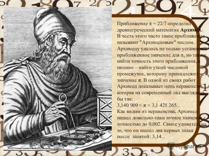 приближение называют "Архимедовым" числом. Архимеду удалось не только установить приближенное значение для π, но также найти точность этого приближения, а именно – найти узкий числовой промежуток, которому принадлежит значение π. В одной из своих работ Архимед доказывает цепь неравенств, которая на современный лад выглядела бы так: