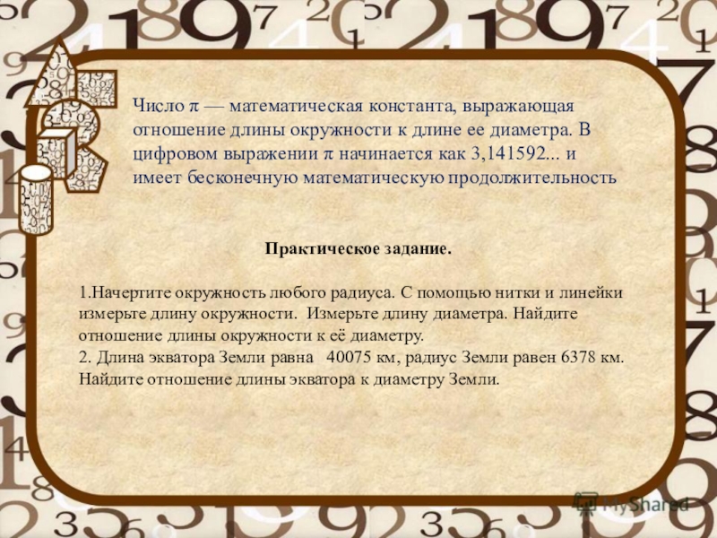 1.Начертите окружность любого радиуса. С помощью нитки и линейки измерьте длину окружности. Измерьте длину диаметра. Найдите отношение длины окружности к её диаметру.