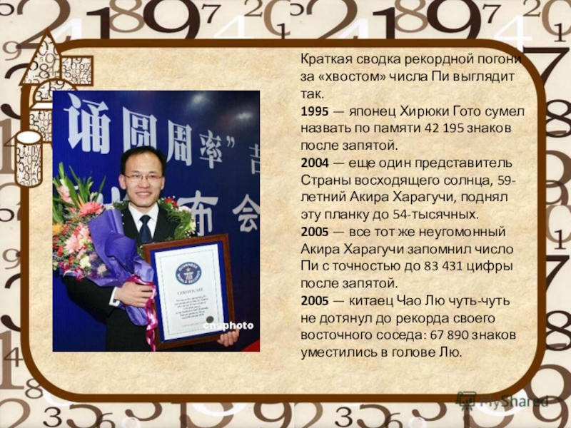 2005 — все тот же неугомонный Акира Харагучи запомнил число Пи с точностью до 83 431 цифры после запятой.