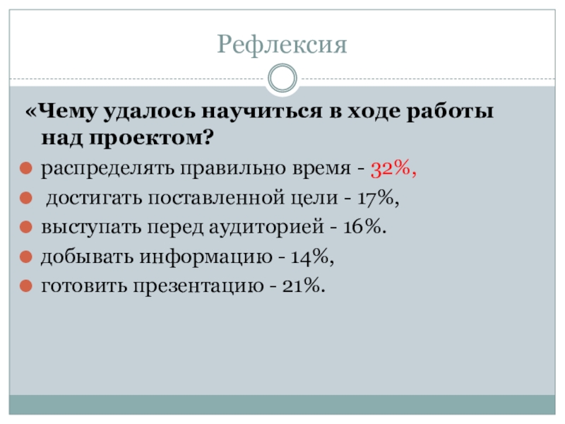 Рефлексия«Чему удалось научиться в ходе работы над проектом? распределять правильно время - 32%, достигать поставленной цели -