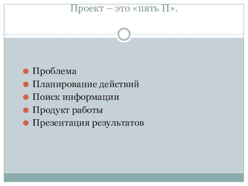 Проект – это «пять П».  ПроблемаПланирование действийПоиск информацииПродукт работыПрезентация результатов