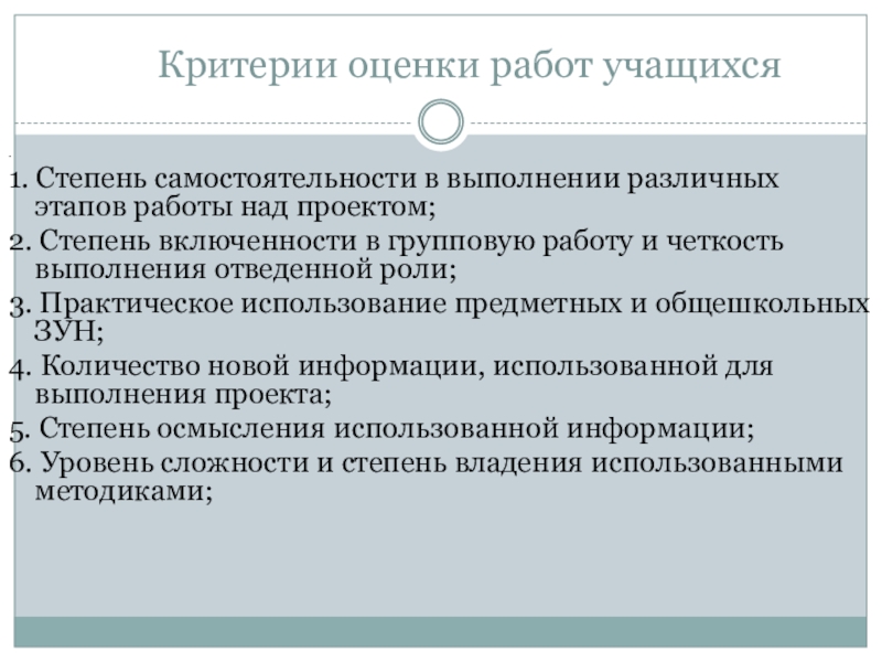 Критерии оценки работ учащихся.1. Степень самостоятельности в выполнении различных этапов работы над проектом;2. Степень включенности в групповую