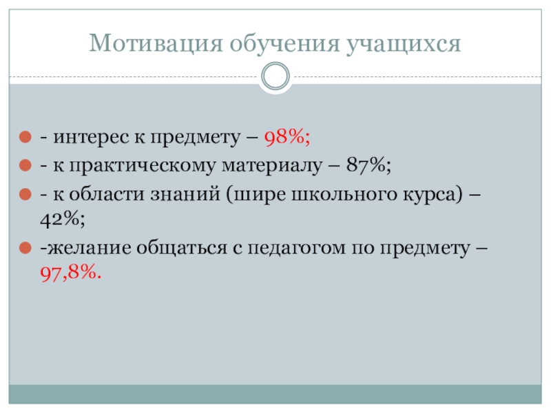 Мотивация обучения учащихся- интерес к предмету – 98%; - к практическому материалу – 87%; - к области
