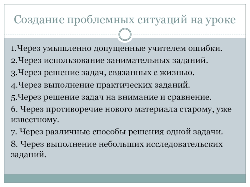 Создание проблемных ситуаций на уроке1.Через умышленно допущенные учителем ошибки.2.Через использование занимательных заданий.3.Через решение задач, связанных с жизнью.4.Через