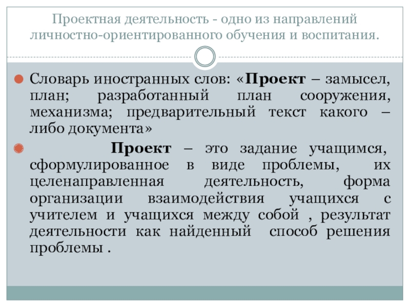 Проектная деятельность - одно из направлений личностно-ориентированного обучения и воспитания. Словарь иностранных слов: «Проект – замысел, план;