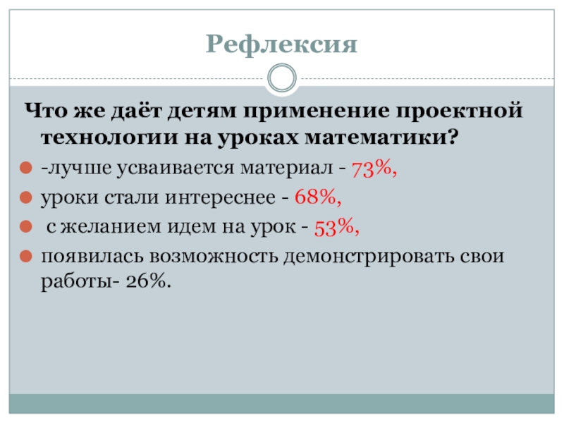 Рефлексия Что же даёт детям применение проектной технологии на уроках математики?-лучше усваивается материал - 73%, уроки стали