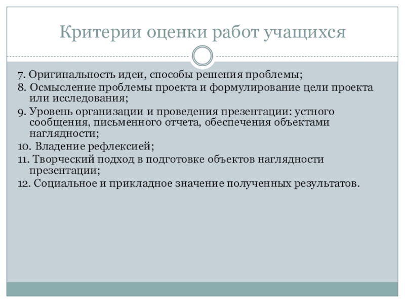 Критерии оценки работ учащихся7. Оригинальность идеи, способы решения проблемы;8. Осмысление проблемы проекта и формулирование цели проекта или