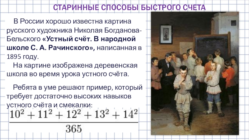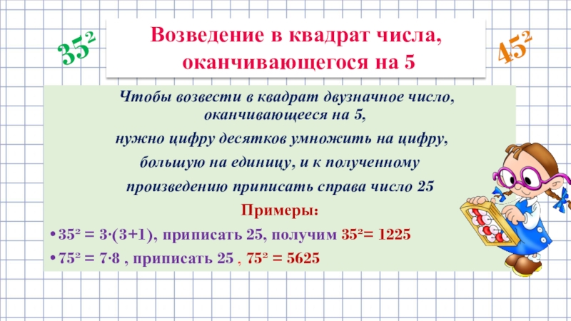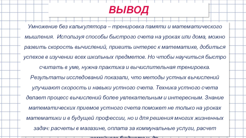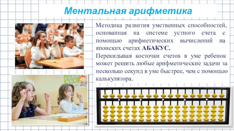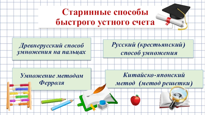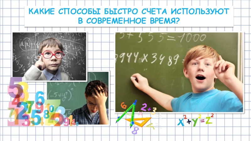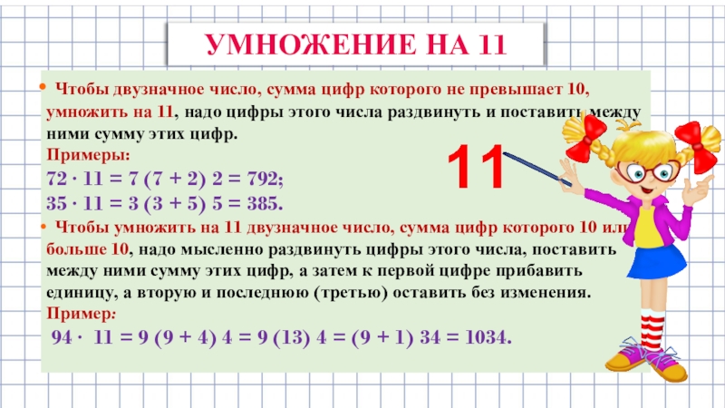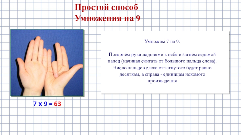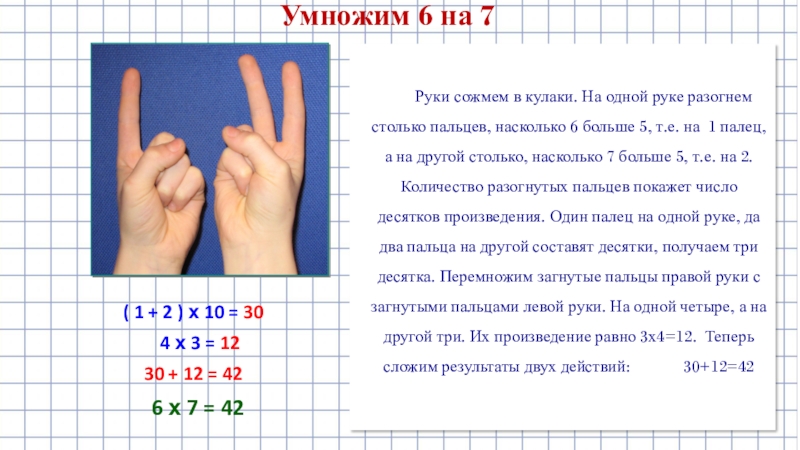 Руки сожмем в кулаки. На одной руке разогнем столько пальцев, насколько 6 больше 5, т.е. на 1 палец, а на другой столько, насколько 7 больше 5, т.е. на 2. Количество разогнутых пальцев покажет число десятков произведения. Один палец на одной руке, да два пальца на другой составят десятки, получаем три десятка. Перемножим загнутые пальцы правой руки с загнутыми пальцами левой руки. На одной четыре, а на другой три. Их произведение равно 3х4=12. Теперь сложим результаты двух действий: 30+12=42