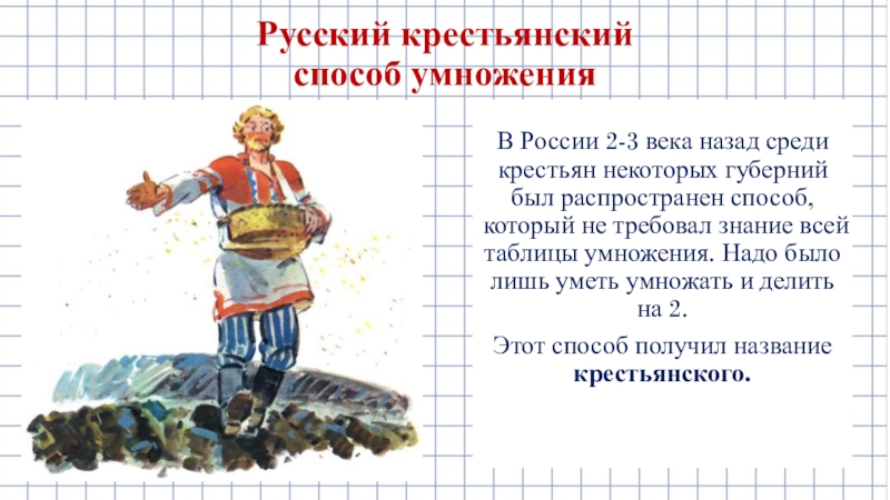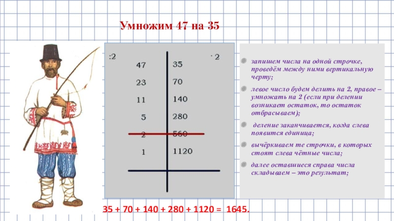 левое число будем делить на 2, правое – умножать на 2 (если при делении возникает остаток, то остаток отбрасываем);