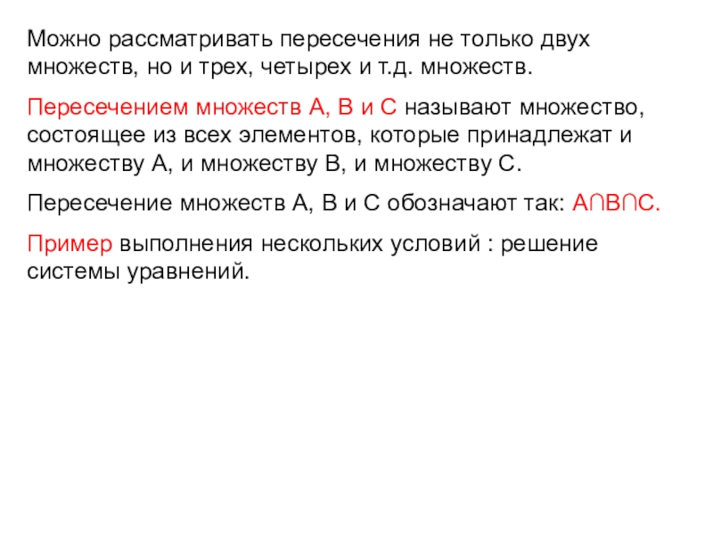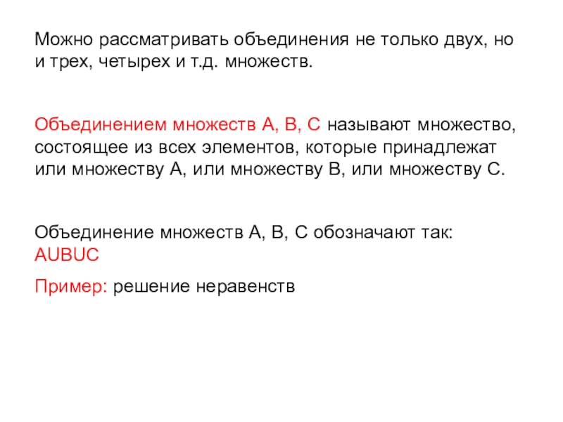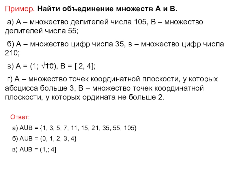 Объединением множеств А и В называют множество, состоящее из всех элементов, которые принадлежат хотя бы одному из множеств – или множеству А, или множеству В.