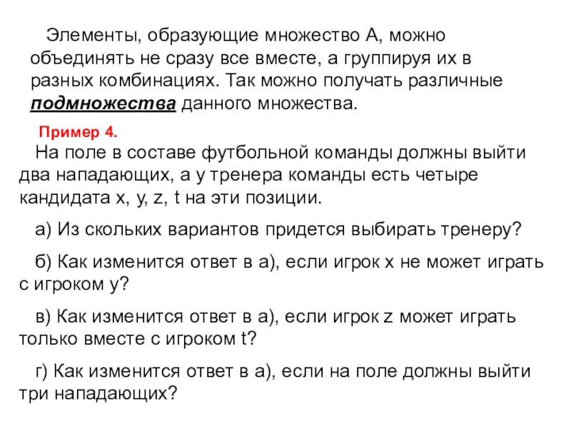 На поле в составе футбольной команды должны выйти два нападающих, а у тренера команды есть четыре кандидата х, у, z, t на эти позиции.