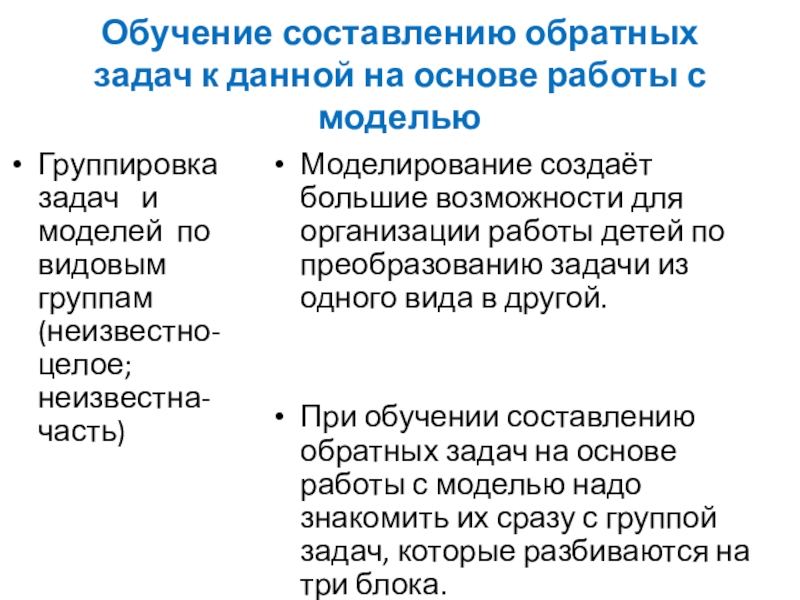 При обучении составлению обратных задач на основе работы с моделью надо знакомить их сразу с группой задач, которые разбиваются на три блока.