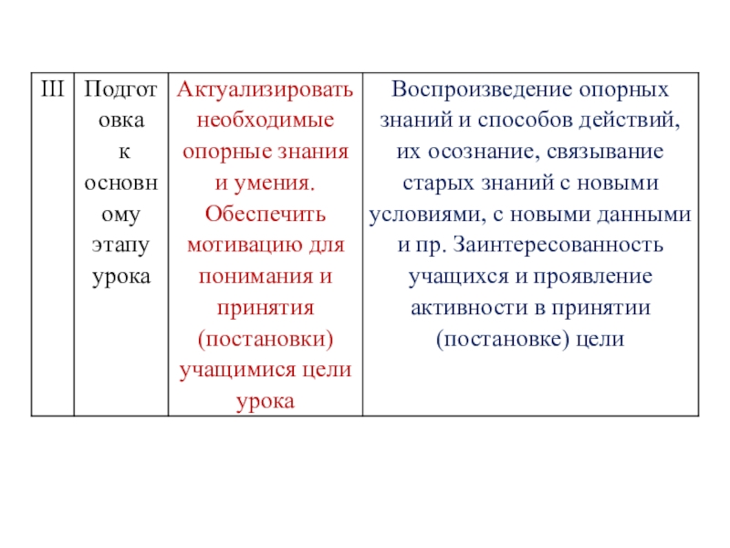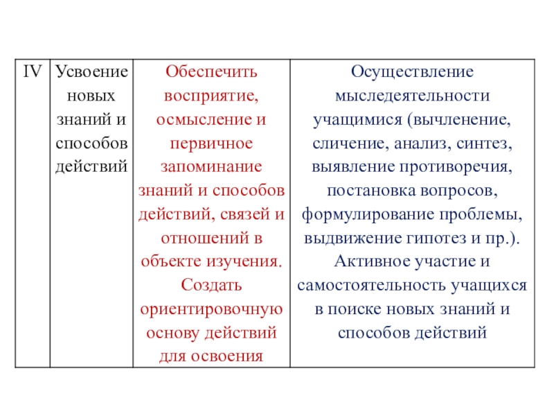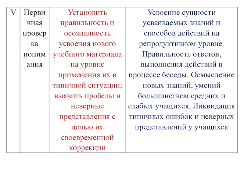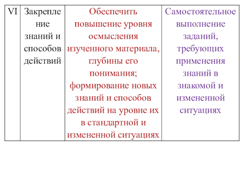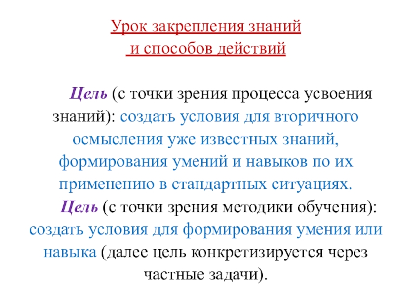 (с точки зрения процесса усвоения знаний): создать условия для вторичного осмысления уже известных знаний, формирования умений и навыков по их применению в стандартных ситуациях.