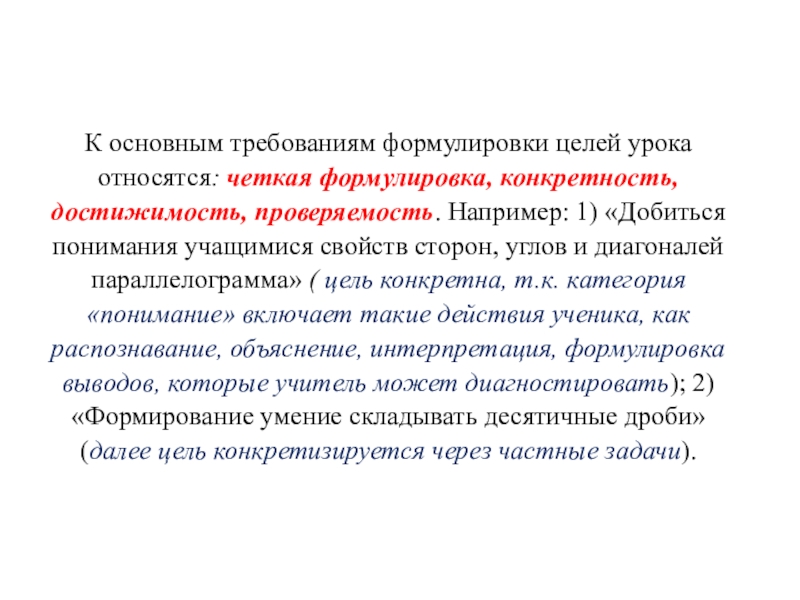 проверяемость. Например: 1) «Добиться понимания учащимися свойств сторон, углов и диагоналей параллелограмма» ( цель конкретна, т.к. категория «понимание» включает такие действия ученика, как распознавание, объяснение, интерпретация, формулировка выводов, которые учитель может диагностировать); 2) «Формирование умение складывать десятичные дроби» (далее цель конкретизируется через частные задачи).