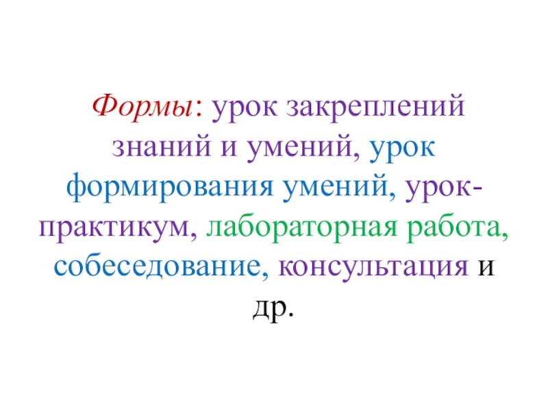 Слайд 26 Формы: урок закреплений знаний и умений, урок формирования умений, урок-практикум,