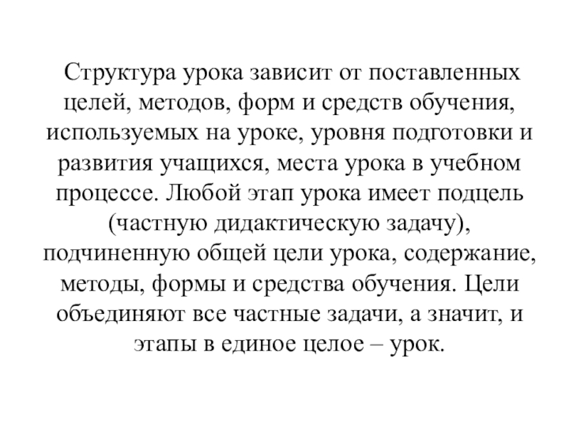 обучения, используемых на уроке, уровня подготовки и развития учащихся, места урока в учебном процессе. Любой этап урока имеет подцель (частную дидактическую задачу), подчиненную общей цели урока, содержание, методы, формы и средства обучения. Цели объединяют все частные задачи, а значит, и этапы в единое целое – урок.
