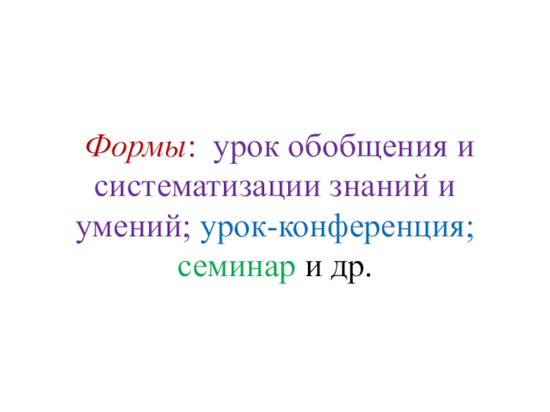 Слайд 32 Формы: урок обобщения и систематизации знаний и умений; урок-конференция; семинар