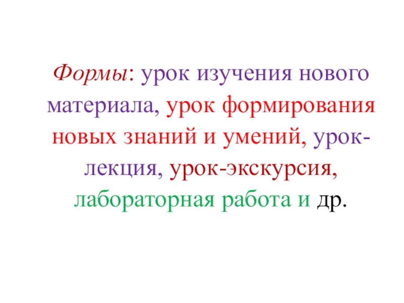 Слайд 23Формы: урок изучения нового материала, урок формирования новых знаний и умений,