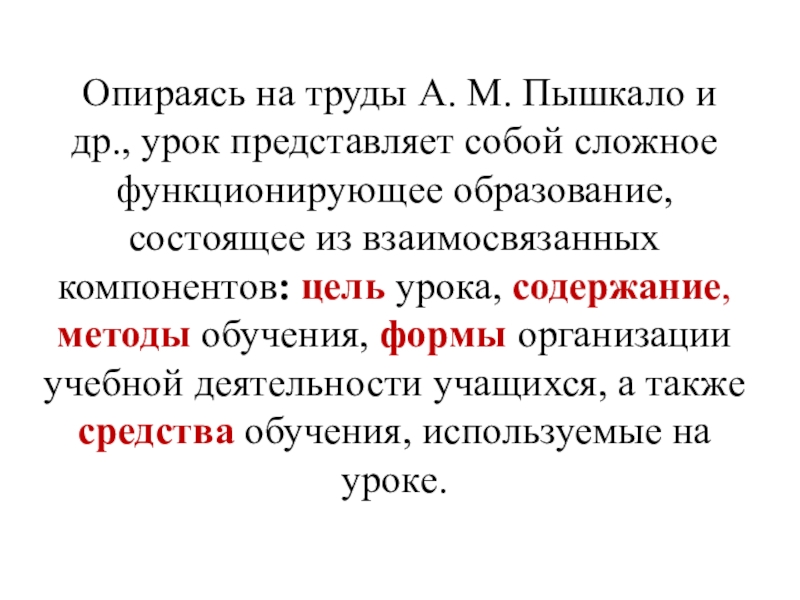 Слайд 4 Опираясь на труды А. М. Пышкало и др., урок представляет