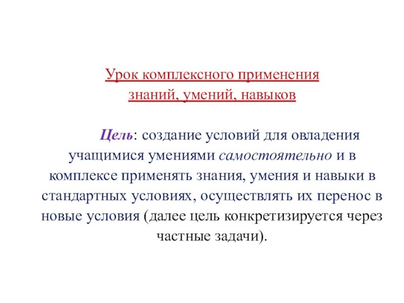 создание условий для овладения учащимися умениями самостоятельно и в комплексе применять знания, умения и навыки в стандартных условиях, осуществлять их перенос в новые условия (далее цель конкретизируется через частные задачи).