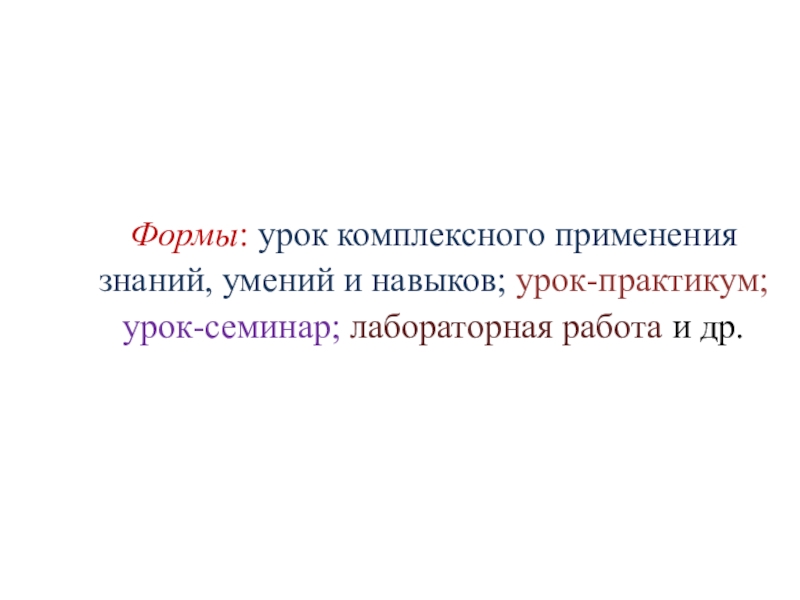 Слайд 29Формы: урок комплексного применения знаний, умений и навыков; урок-практикум; урок-семинар; лабораторная