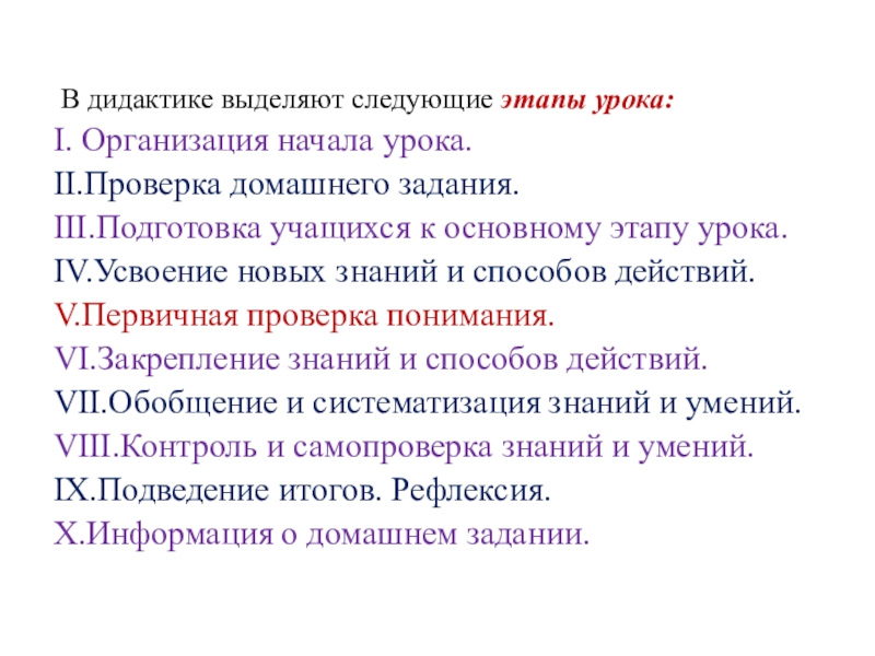 Слайд 8 В дидактике выделяют следующие этапы урока: