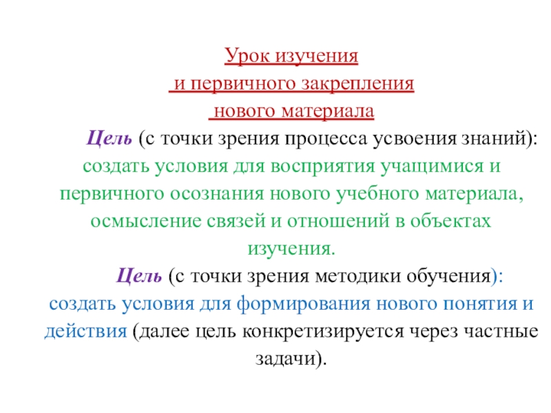 (с точки зрения процесса усвоения знаний): создать условия для восприятия учащимися и первичного осознания нового учебного материала, осмысление связей и отношений в объектах изучения.