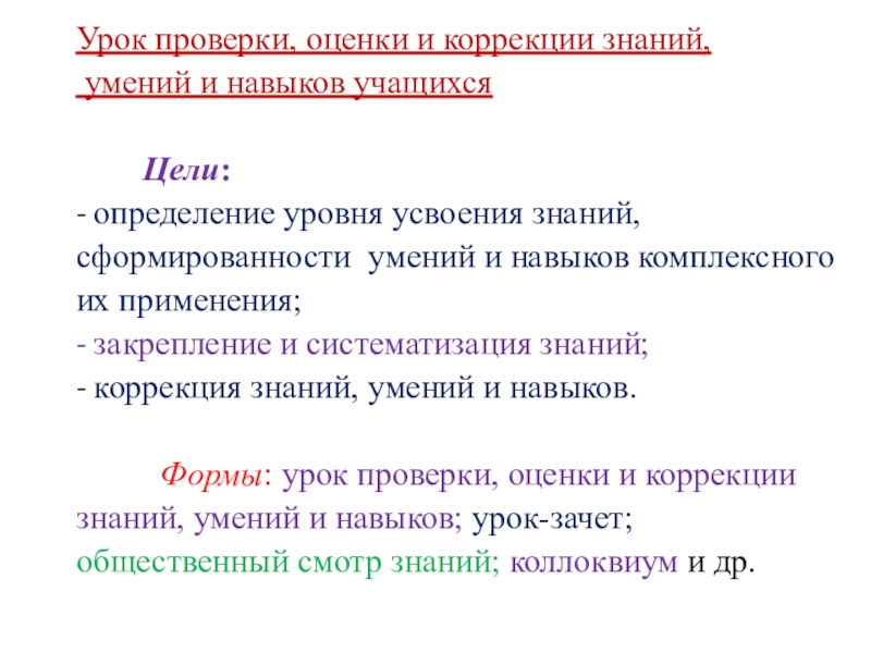 Формы: урок проверки, оценки и коррекции знаний, умений и навыков; урок-зачет; общественный смотр знаний; коллоквиум и др.
