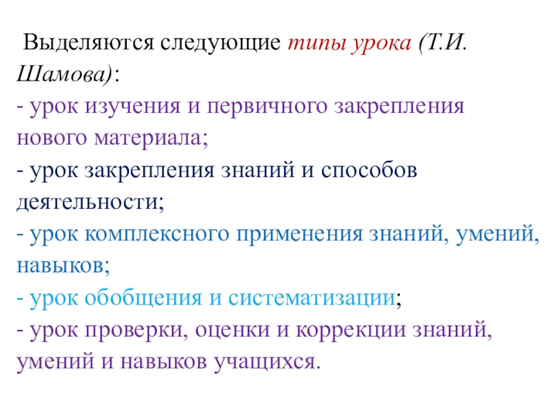 Слайд 20 Выделяются следующие типы урока (Т.И. Шамова):