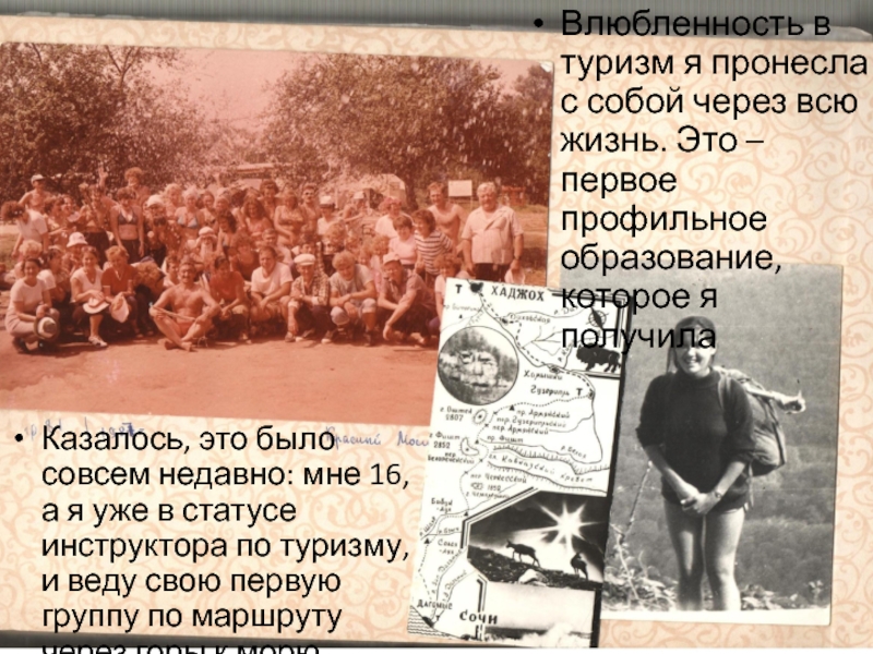 Слайд 2В туризме я с 16 лет, т.е. уже 30 лет. А