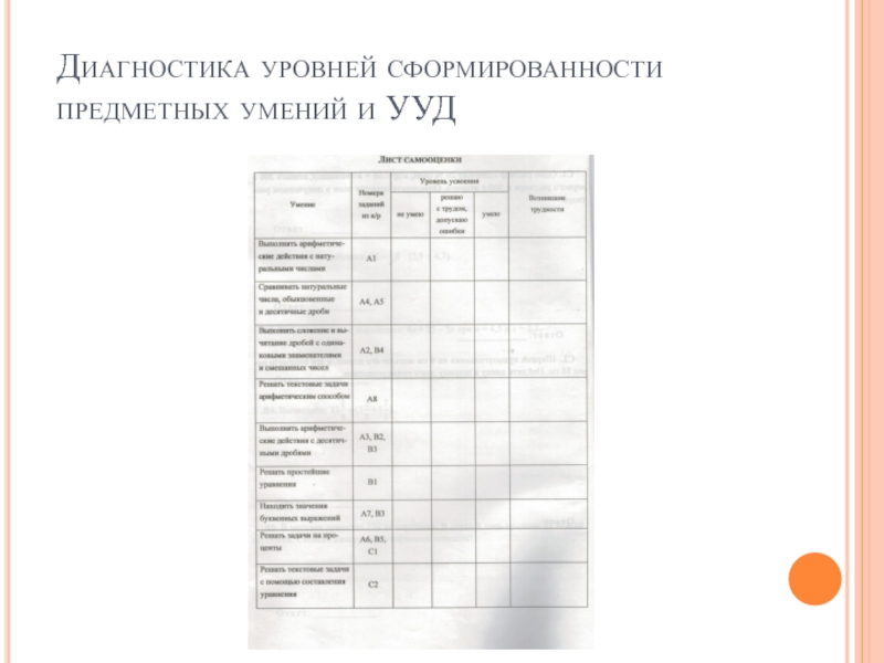 Слайд 10Диагностика уровней сформированности предметных умений и УУД