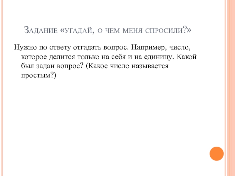 Задание «угадай, о чем меня спросили?»Нужно по ответу отгадать вопрос. Например, число, которое делится только на себя