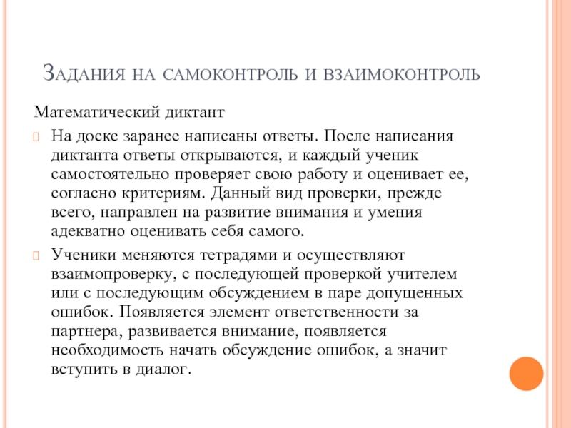 Задания на самоконтроль и взаимоконтрольМатематический диктантНа доске заранее написаны ответы. После написания диктанта ответы открываются, и каждый