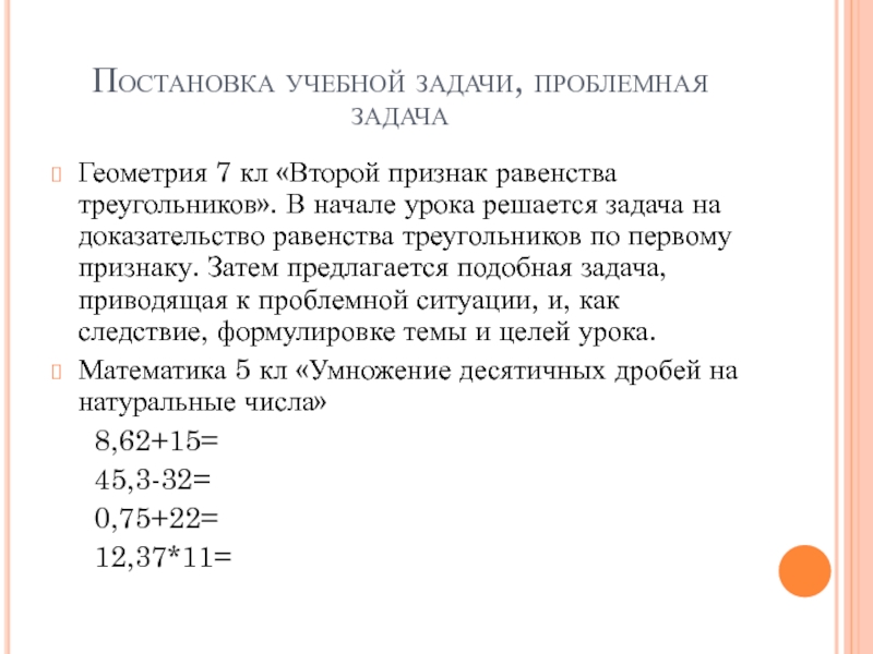 Постановка учебной задачи, проблемная задачаГеометрия 7 кл «Второй признак равенства треугольников». В начале урока решается задача на
