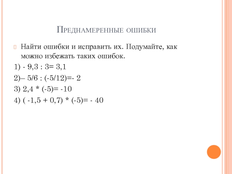 Преднамеренные ошибкиНайти ошибки и исправить их. Подумайте, как можно избежать таких ошибок.1) - 9,3 : 3= 3,1 2)–