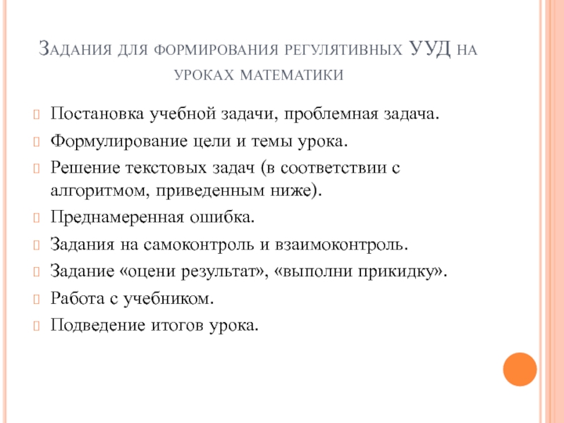 Задания для формирования регулятивных УУД на уроках математикиПостановка учебной задачи, проблемная задача.Формулирование цели и темы урока.Решение текстовых задач (в соответствии с алгоритмом, приведенным ниже).Преднамеренная ошибка.Задания на самоконтроль и взаимоконтроль.Задание «оцени результат», «выполни прикидку».Работа с учебником.Подведение итогов