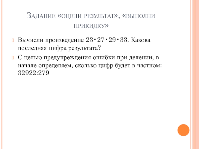 Задание «оцени результат», «выполни прикидку»Вычисли произведение 23•27•29•33. Какова последняя цифра результата?С целью предупреждения ошибки при делении, в