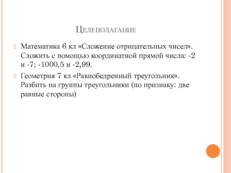 ЦелеполаганиеМатематика 6 кл «Сложение отрицательных чисел». Сложить с помощью координатной прямой числа: -2 и -7; -1000,5 и